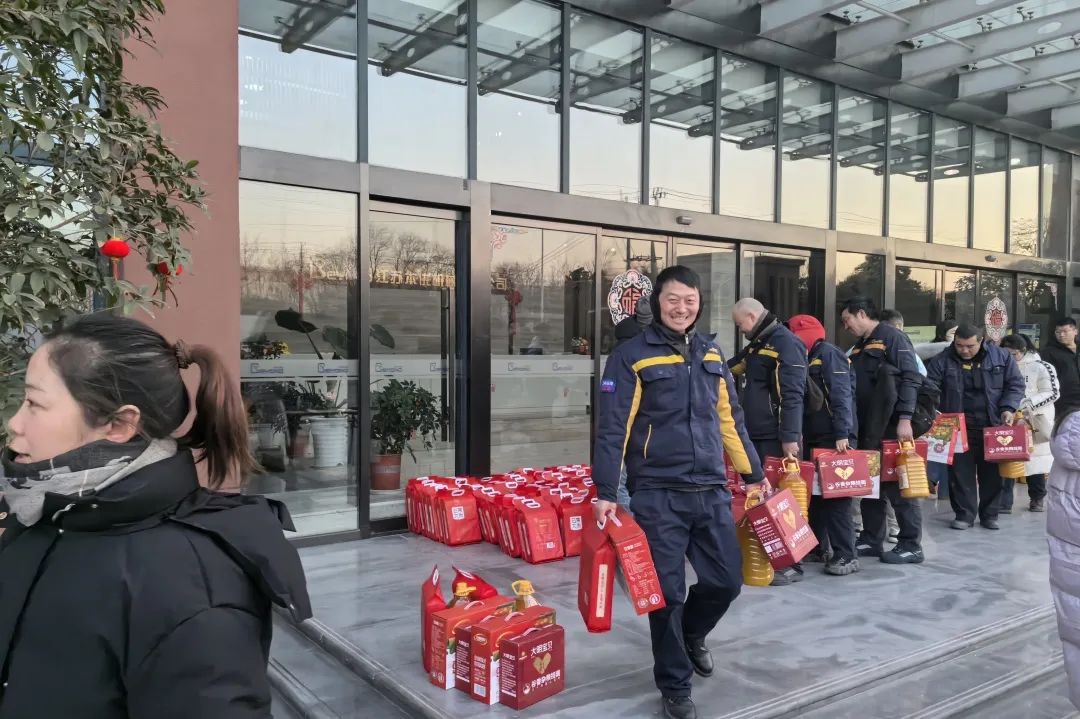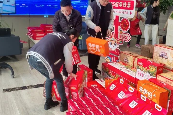 各部门员工纷纷前来领取新年伴手礼,一箱箱暖心的礼品正有序地发放到员工手中,现场气氛热烈,沉甸甸的礼品捧在手里,笑在脸上,暖在心头,员工们的幸福之情溢于言表。