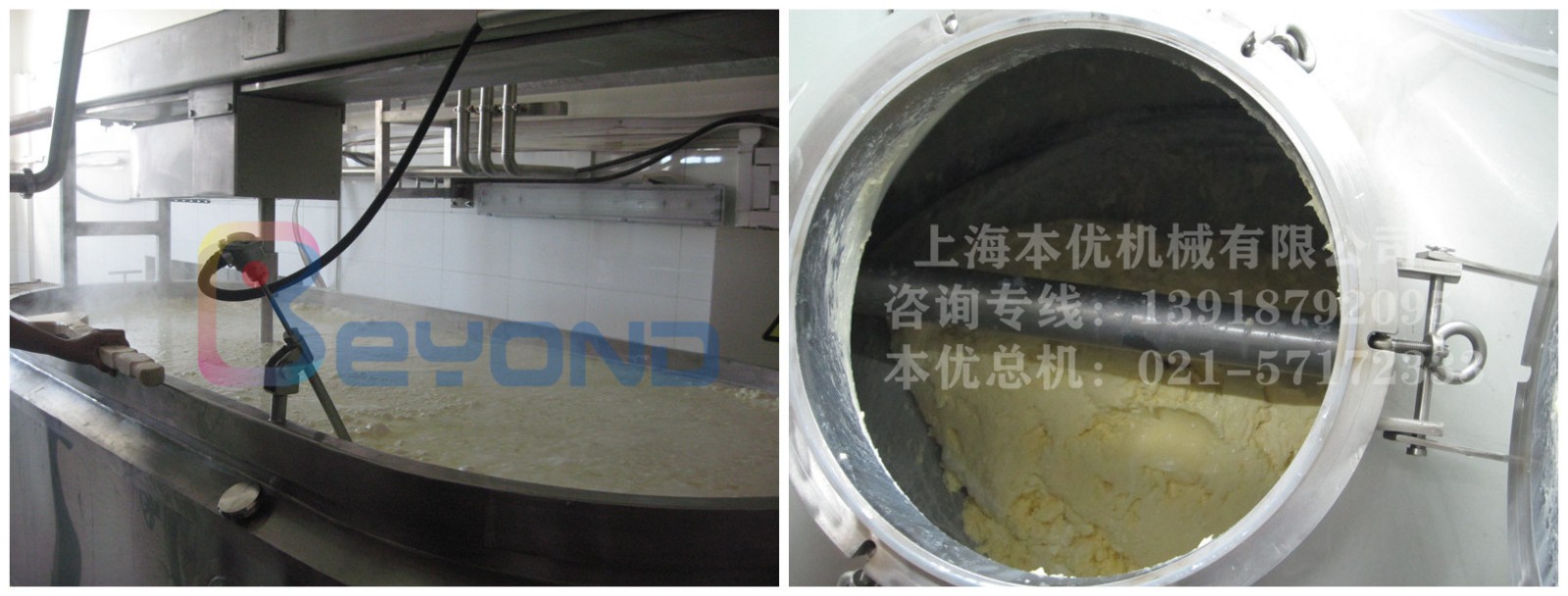 Cheese process: raw milk → standardization → sterilization → cooling → adding starter → adjusting acidity → adding calcium chloride → adding pigment → adding coagulant → cutting clot → stirring → heating → whey discharge → molding and pressing → salting → ripening → coloring and waxing → finished products